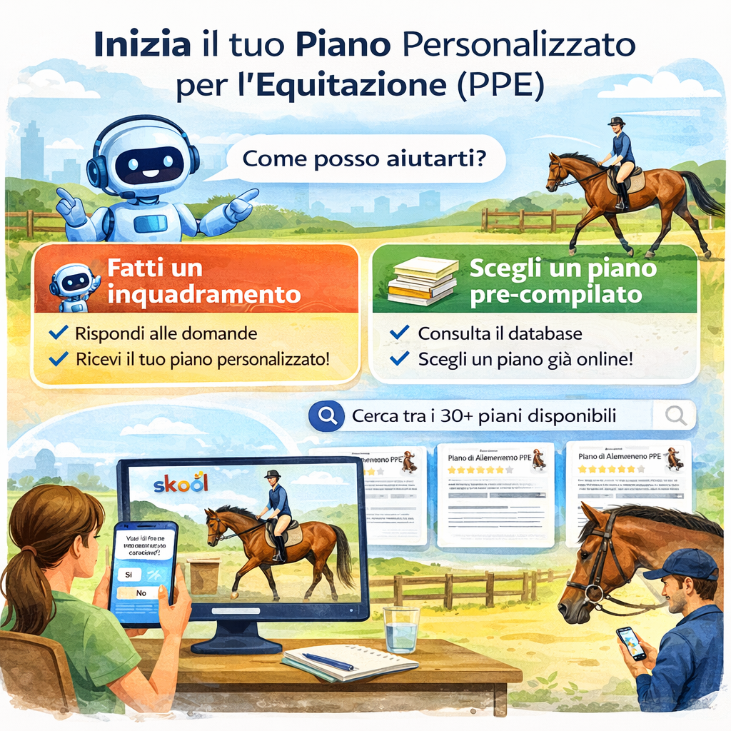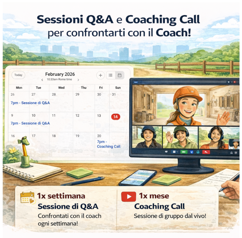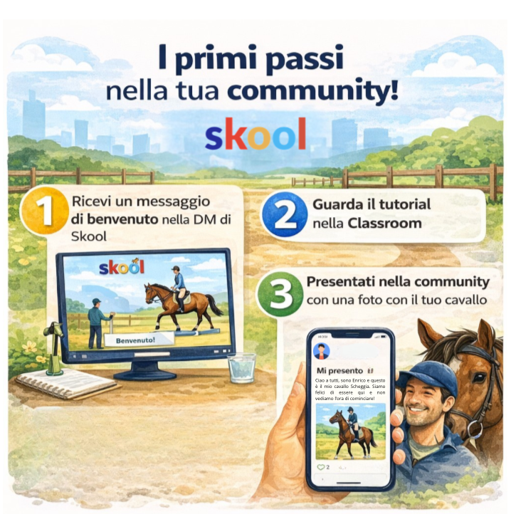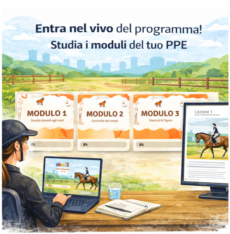 Appena entrerai, ti arriverà un messaggio e un video di Benvenuto da me, in cui ti spiego come muoverti. Trovi anche un Tutorial nella "Classroom". Potrai presentarti insieme al tuo cavallo nella Community e verrai accolto/a dagli altri allievi del PPE.